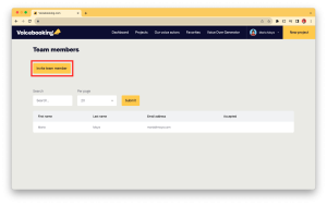By clicking on “Invite team member”, filling in the details and clicking on “Send”, you can invite new users to Voicebooking or even existing users of our platform.